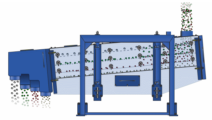 方形搖擺篩啟動后,篩機搖動體即篩箱在慣性力的作用下做前后往復(fù)運動,篩箱帶動篩面做周期性搖動,從而使篩面上的物料隨篩箱一同做定向跳躍式運動,期間,小于篩面孔徑的物料通過篩孔落到下層,成為篩下物,大于篩面孔徑的物料經(jīng)連續(xù)翻滾跳躍運動后從排料款排出,完成篩分工作。