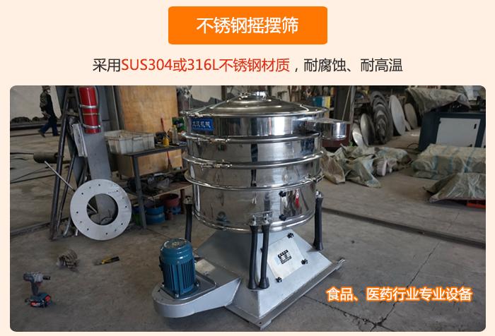 不銹鋼搖擺篩主要采用SUS304或316L不銹鋼材質,耐腐蝕、耐高溫、不易生銹、不污染原料,是食品、醫藥行業專用篩分設備。由于不銹鋼搖擺篩模擬了人類手工篩分動作和過程,做三維圓周運動,巧妙的把篩(平面圓周運動)、簸(向上拋物運動)結合起來,既有圓周運動,又有上拋運動,所以搖擺篩具有篩分精度高、效率高、產量大、篩網壽命長的特點(可達到普通振動篩的5-10倍),應用于各種精細、超細范圍內的微粒狀物料,更加適合難以處理的物料。