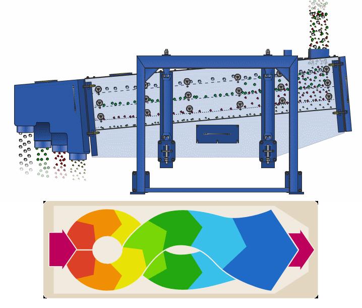 石英砂方形搖擺篩的篩箱在慣性力的作用下作前后往復運動,并帶動篩面做周期性搖動,促使篩面上的物料隨篩箱一同做定向跳躍式運動,小于篩面孔徑的物料通過篩框落到下層,稱為篩下物,大于篩面孔徑的物料經連續(xù)翻滾跳躍運動后從前端排料口排出,繼而完成篩分作業(yè)。